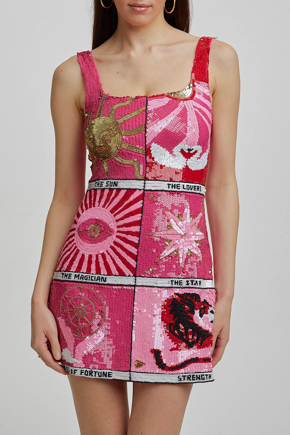 A true wearable work of art. Easy Tiger's Tarot dress features 6 beaded and embroidered tiles that were inspired by uplifting tarot cards that symbolise joy, love, and empowerment. A statement piece designed to elevate your energy.Â